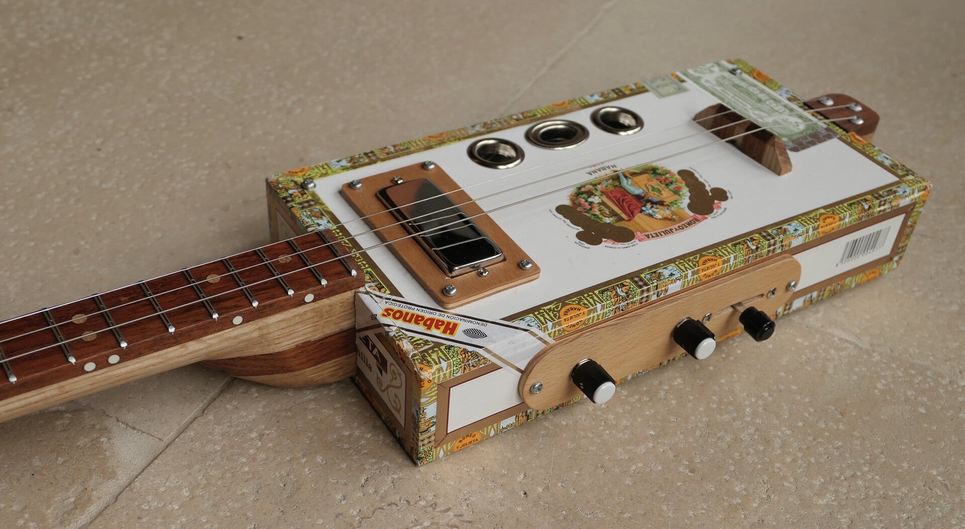 3-string Cigar Box Guitar, handgemaakt, akoustisch/electrisch, mensuur 25,5", 17 fretten, eikenhouten hals, 3-way switch voor mini humbucker + piëzo element.